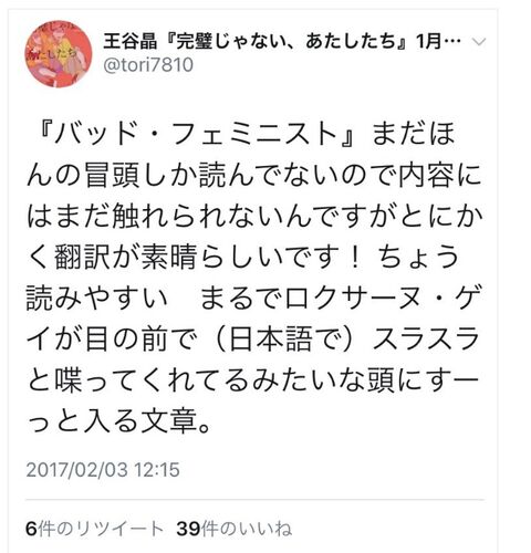 この件は毎年言及することにしていたのに、昨年はそれを忘れてしまったので、その穴埋めも兼ねて今年はブログで紹介します。 王谷晶さんのこのツイートを大いに参考にし、「バッドフェミニスト」を購入して読み始めたわけですが、野中モモさんによる翻訳があ…